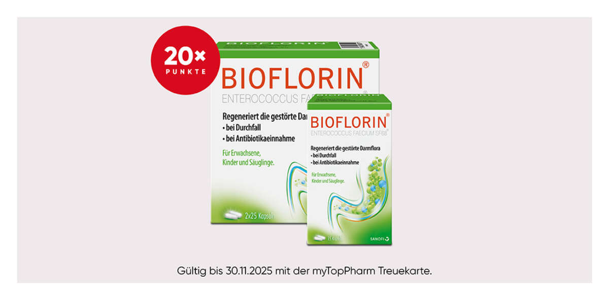 Der in BIOFLORIN® enthaltende lebende Bakterienstamm der Spezies Enterococcus faecium SF68® schafft die Basis für eine ausgewogene Darmflora. Seit 45 Jahren ist es das einzige Arzneimittel in der Schweiz, das Enterococcus faecium SF68 enthält. SF68® regeneriert die gestörte Darmflora, hilft gegen Durchfall und hemmt darmschädigende Bakterien. BIOFLORIN® zeichnet sich durch eine besonders gute Verträglichkeit aus, kann bereits ab dem Säuglingsalter eingesetzt werden und ist damit ein Probiotikum für die ganze Familie.