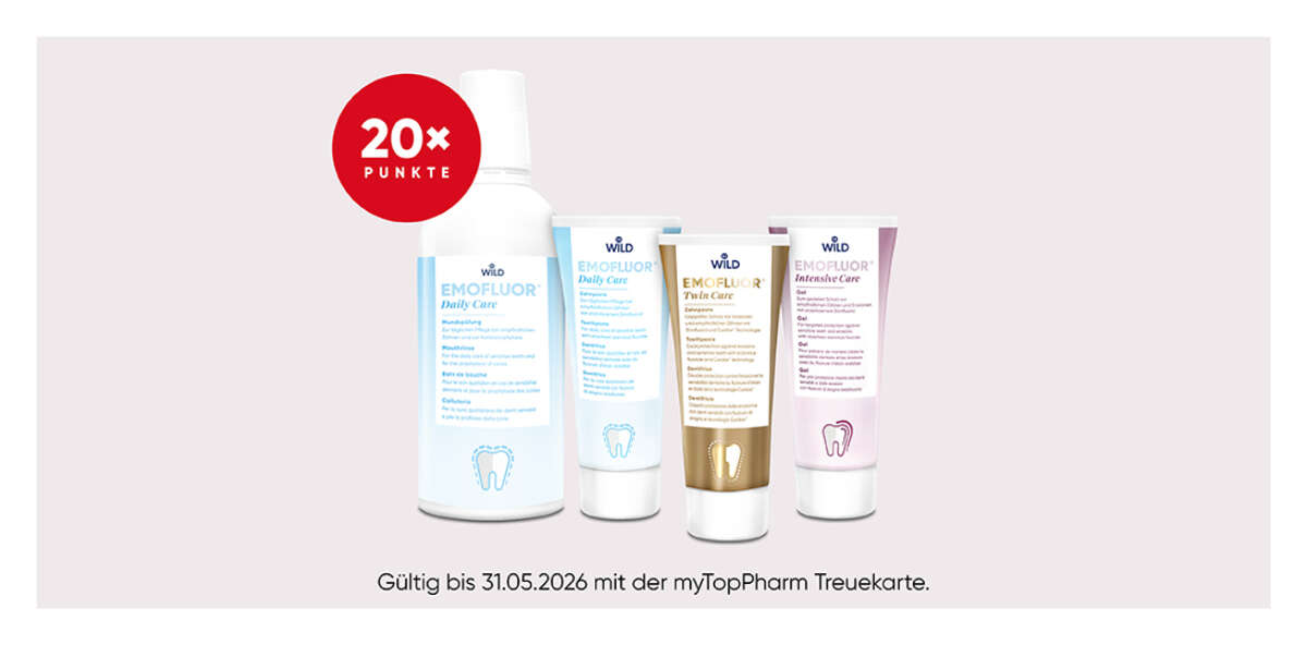 Entdecken sie jetzt in ihrer Toppharm Apotheke die EMOFLUOR Produkte von WILD, einem Schweizer Familienunternehmen. EMOFLUOR steht für die optimale Pflege und Desensibilisierung von schmerzempfindlichen Zähnen.
