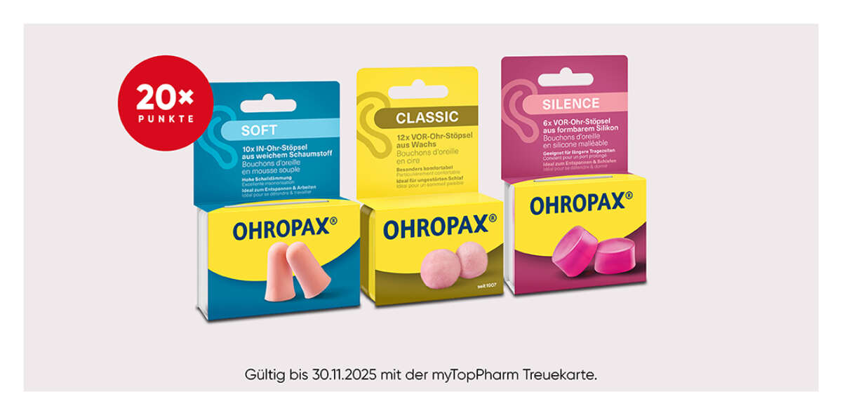 Die schädlichen Auswirkungen von Lärm auf das Gehör sind bekannt. Die Welt von OHROPAX ist vielfältig, für jedes Ohr und jedes Bedürfnis gibt es den richtigen Ohrstöpsel. OHROPAX®, der Erfinder der Ruhe, bietet Ohrstöpsel aus verschiedenen Materialien und Grössen an. Alle Ohrstöpsel haben ausgezeichnete Schallschutzwerte, sind angenehm zu tragen und eignen sich für unterschiedliche Geräuschbedingungen.