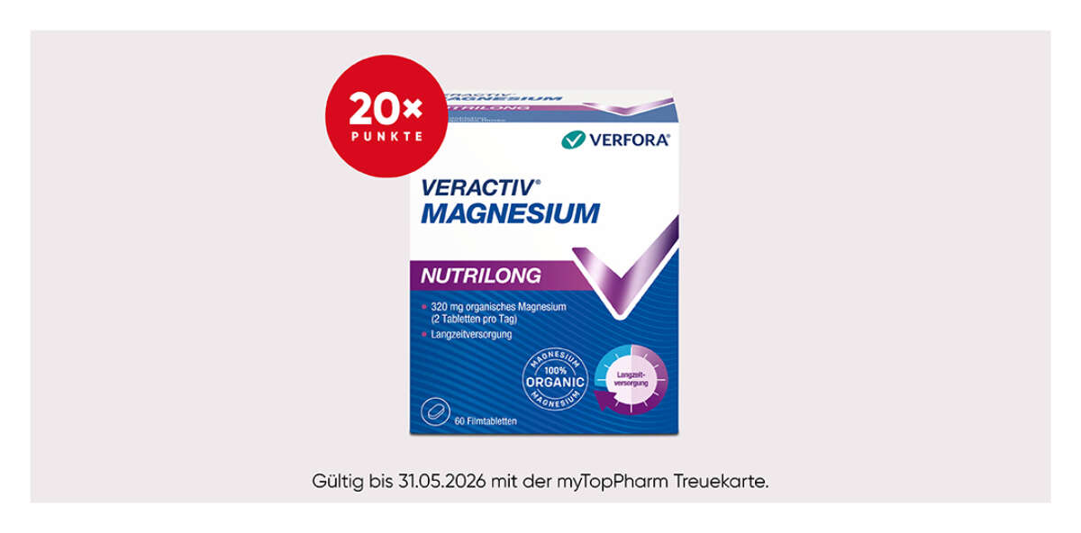 Veractiv® Magnesium Nutrilong ist eine innovative Filmtablette zur Langzeitversorgung. Dank der einzigartigen Matrix-Technologie wird der Körper über längere Zeit mit organischem Magnesium versorgt. Die geschmacksneutrale Tablette enthält zudem einen magensaftresistenten Überzug für eine gezielte und kontinuierliche Freigabe im Darm, wo die Magnesiumaufnahme stattfindet. Bei einer Empfindlichkeit gegenüber hohen Magnesiumdosen oder für eine Nacht mit entspannten Muskeln ist eine schrittweise Freisetzung des Magnesiums wie bei Veractiv® Magnesium Nutrilong von Vorteil. Zwei Tabletten enthalten 320 mg Magnesium und decken den normalen Tagesbedarf eines Erwachsenen.