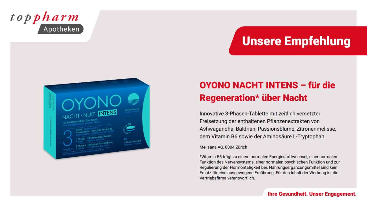 OYONO NACHT ist eine innovative 3-Phasen-Tablette mit zeitlich versetzter Freisetzung der enthaltenen Pflanzenextrakte von Ashwagandha, Baldrian, Passionsblume, Zitronenmelisse, dem Vitamin B6 sowie der Aminosäure L-Tryptophan. Das Besondere an OYONO NACHT ist, dass die enthaltenen Inhaltsstoffe nach Einnahme der Tablette nicht alle sofort, sondern zeitlich versetzt freigesetzt werden. Die Sofort- und Langzeitversorgung unterstützt die Regeneration* in der Nacht. Die Einnahme sollte mit einer OYONO Nacht-Tablette täglich ungefähr 60 Minuten vor dem Schlafengehen erfolgen. So kann die Freisetzung von OYONO NACHT über die Nacht hinweg anhalten. Die Tablette dabei unzerkaut mit etwas Flüssigkeit schlucken. OYONO NACHT kann über einen längeren Zeitraum eingenommen werden. Die enthaltenen Stoffe haben alle eine lange Tradition in verschiedenen Zubereitungen, Kombinationen und Dosierungen. OYONO NACHT ist vegan, laktosefrei und glutenfrei und somit auch für Vegetarier und Veganer sowie Personen mit entsprechenden Unverträglichkeiten geeignet. Das Produkt ist in Packungen à 20 und 40 Stück in Apotheken und Drogerien erhältlich. Für einen erholten Start in den neuen Tag!