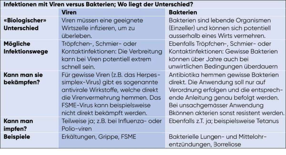 Um eine Infektion möglichst zielgerichtet zu behandeln, ist es absolut zentral, zwischen Viren und Bakterien unterscheiden zu können. Dies sind die grundlegendsten Unterschiede: