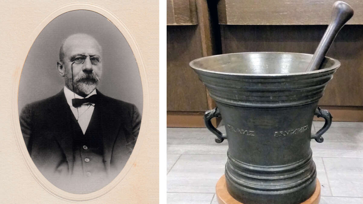 1981 übernahm der jetzige Besitzer, Max Forster das Geschäft von seinem Vater Adolf. Zusammen mit seinem langjährigen Team hat er heuer den 300. Jahrestag der Apotheke gefeiert und ist stolz auf seine bis ins 18. Jahrhundert verfolgbare Familiengeschichte. Stolz präsentiert er den grossen Mörser, der alle Besitzerwechsel überlebt hat und sich einst im Besitz der Familie Brunner befand.