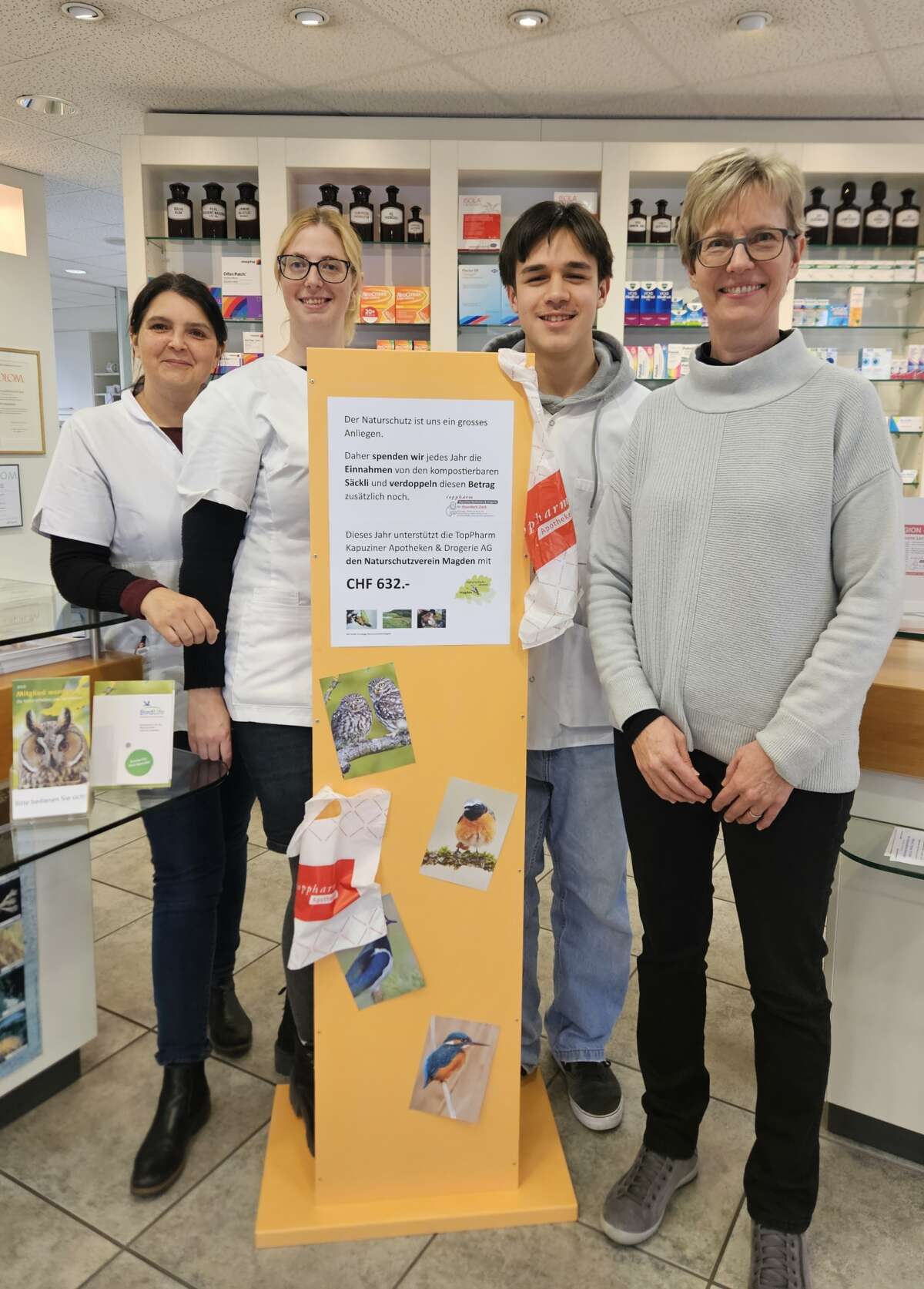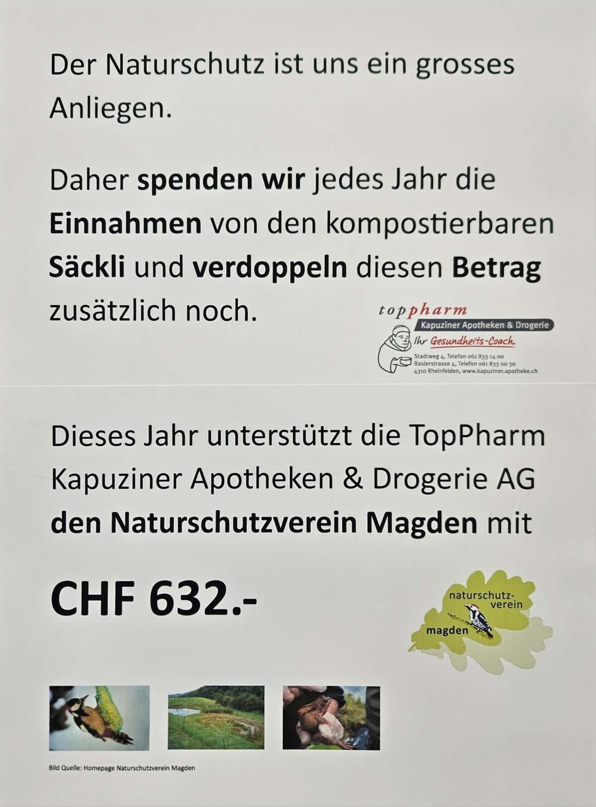 Die Einnahmen aus dem Verkauf der Säckli verdoppeln wir und spenden sie einmal jährlich an einen guten Zweck. Dieses Jahr konnten wir dank Ihrer Unterstützung 632 Franken an den Naturschutzverein Magden übergeben.