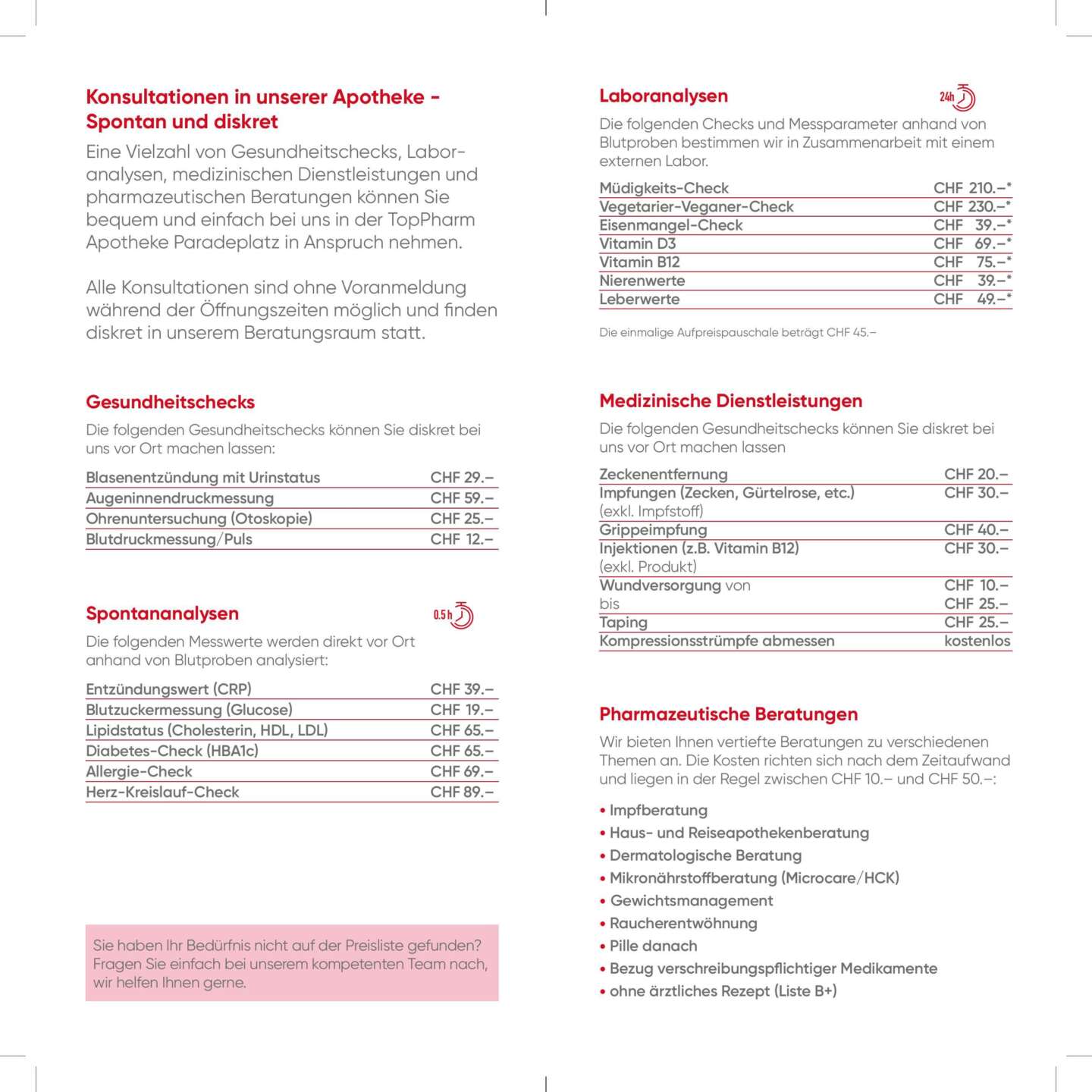 Spontan und diskret können Sie bei uns eine Vielzahl von Gesundheitschecks, Laboranalysen, medizinischen Dienstleistungen und pharmazeutischen Beratungen in Anspruch nehmen.